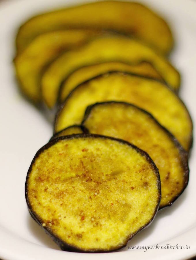 Baingan bhaja or Begun bhaja is a Bengali recipe, where baingan (eggplant, aubergine) is cut into thin slices, marinated for about 20 minutes and then shallow fried. Soft, warm and mildly spiced, these discs of fried eggplant are served as snack but you can also enjoy them as a side with roti or rice.
