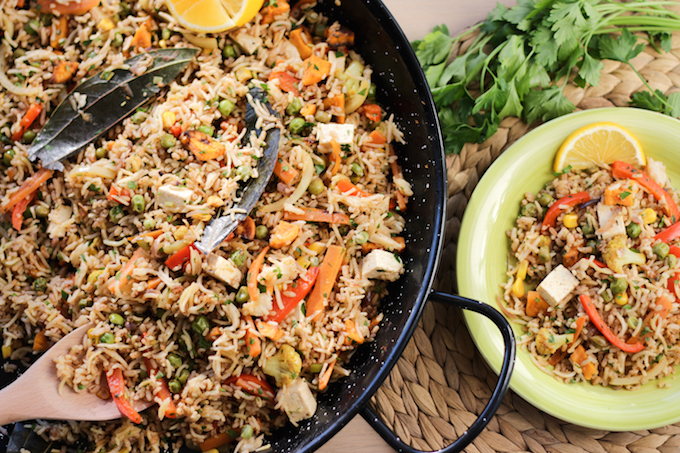 This vegetarian paella is loaded with seasonal vegetables, tofu, a mix of white and brown rice and fresh flavours. It is fresh, hearty, healthy and super easy to make. I always picture paella as being super colourful, so I added lots of different types of veggies – onions, sweet potato, different bell peppers, corn, peas, carrots… almost all veggies that are currently available and will go well together.