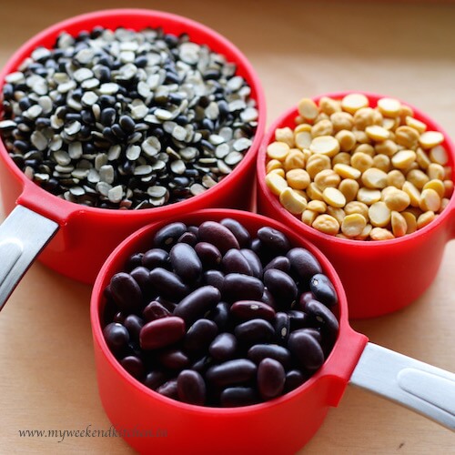 - Wash and soak urad dal, chana dal and rajma in three cups of water for six hours.
