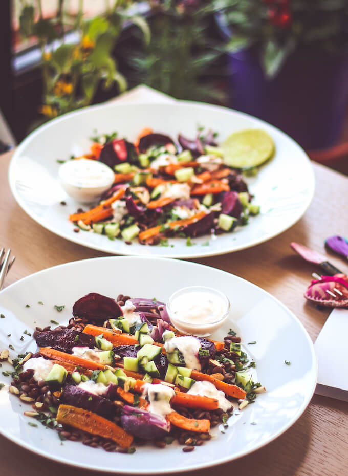 Warm lentils with oven roasted vegetables and a light yoghurt sauce, this lentil salad is a nourishing weekend lunch. I love the colours different ingredients bring in — brown lentils, crimson beets, orange carrots, red onions, green cucumbers, white yogurt. It is a delight to see and eat it.