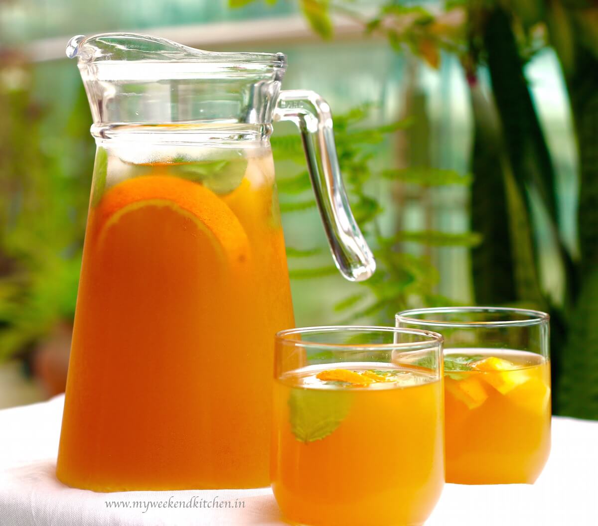 - To prepare, add the orange slices and mint leaves in the serving jar/ bottle. Add the concoction and cold water. Mix well. Add ice if required.
