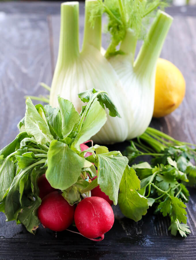 - Thinly slice radish and fennel. Keep the dill-like fennel leaves too