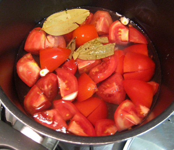 - In a pan, heat about 3 cups of water. Add tomatoes (cut into quarters or 8 each), bay-leaves and garlic cloves. Boil till the tomatoes turn soft.