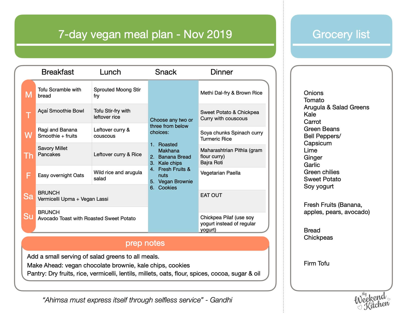 The one-week vegan meal plan that I share every month is an attempt to give ideas of how a balanced vegan meal is possible for every day of the week. In addition, meal planning helps in more efficient and economical grocery shopping and reduces food and time wastage. Here’s this month’s 7-day vegan meal plan with recipe links and a printable pdf to download with a grocery list and meal prep notes.